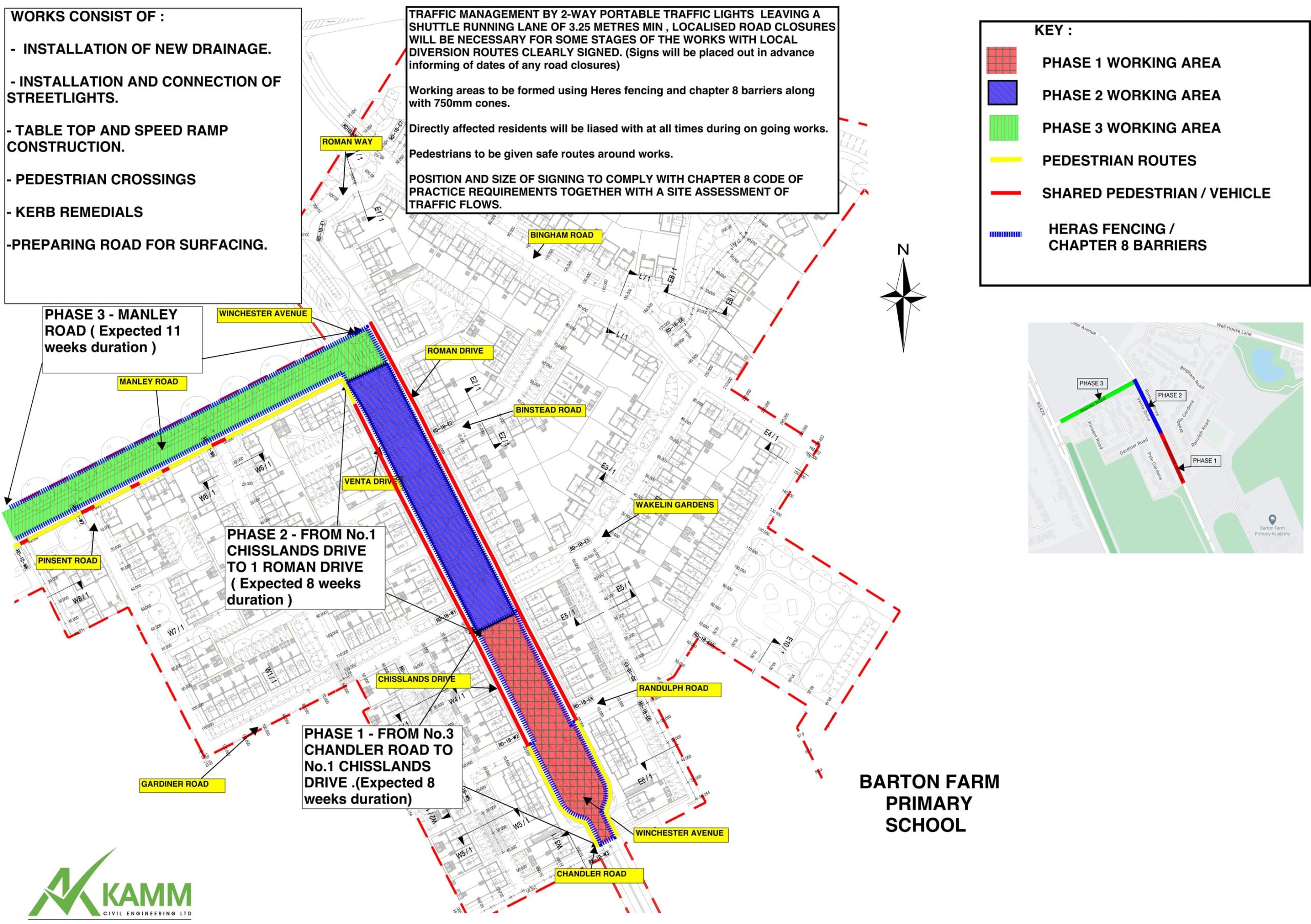 The initial programme of works on Winchester Avenue will be carried out in three phases from 3rd November and are expected to be completed by June 2026. The works include upgrading drainage to swales, installing and connecting upgraded streetlights, constructing tabletops and speed ramps, creating new new pedestrian crossings and footpaths, and preparing for final road surfacing next year.